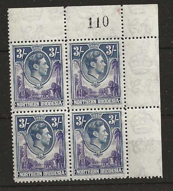 Northern Rhodesia 1938 George VI Three Shillings marginal block with sheet No 110 unmounted mint. SG 42.