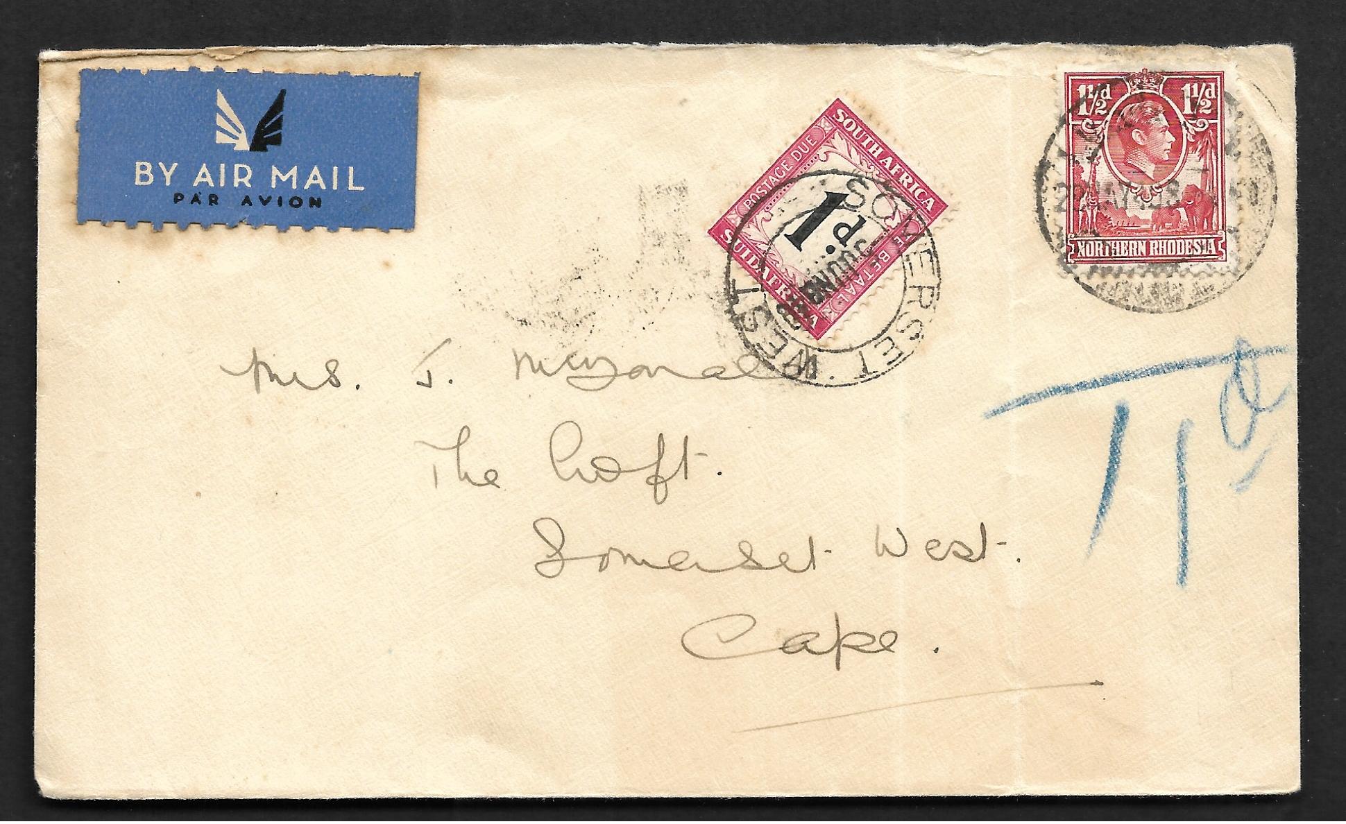 Northern Rhodesia 1940 George VI uncensored cover to South Africa. Taxed One Penny on arrival and postage due added. Arrival mark on back.