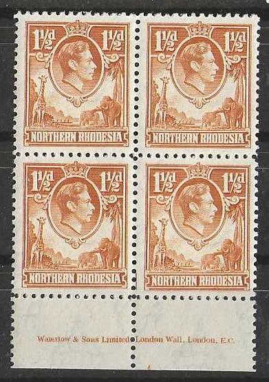 Northern Rhodesia 1941 George VI One and a Half Pence bottom margin Imprint block of four unmounted mint. SG 30.