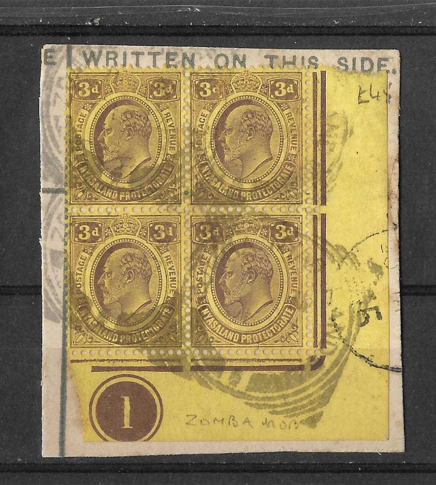 Nyasaland 1908 Edward VII Three Pence Plate block on piece with Zomba Square Circle postmark. SG 76.