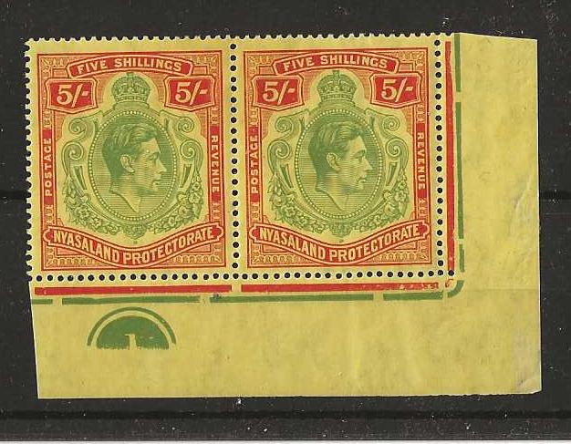 Nyasaland 1938 George VI Five Shillings Keyplate bottom right marginal pair with Plate 1 unmounted mint. SG 141. Cat £110+.