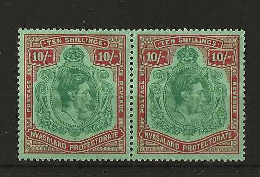Nyasaland 1938 George VI Ten Shillings pair unmounted mint. SG 142. Cat £120.