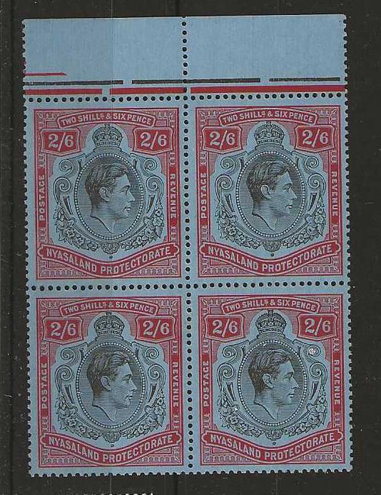 Nyasaland 1938 George VI Two Shillings and Six Pence top marginal block of four unmounted mint. SG 140. Cat £72.