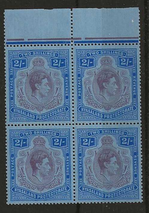 Nyasaland 1938 GVI Two Shillings marginal block SG 139 unmounted mint