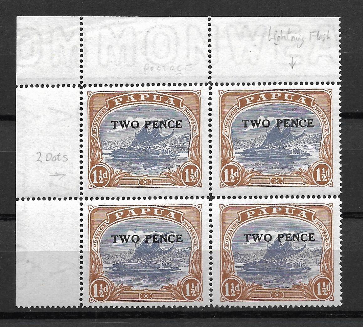 Papua 1931 Ash printing Two Pence on One and a Halfpence top left corner marginal block of four with 3 flaws, Double dots, Postace and lightning flash unmounted mint. SG 122a.