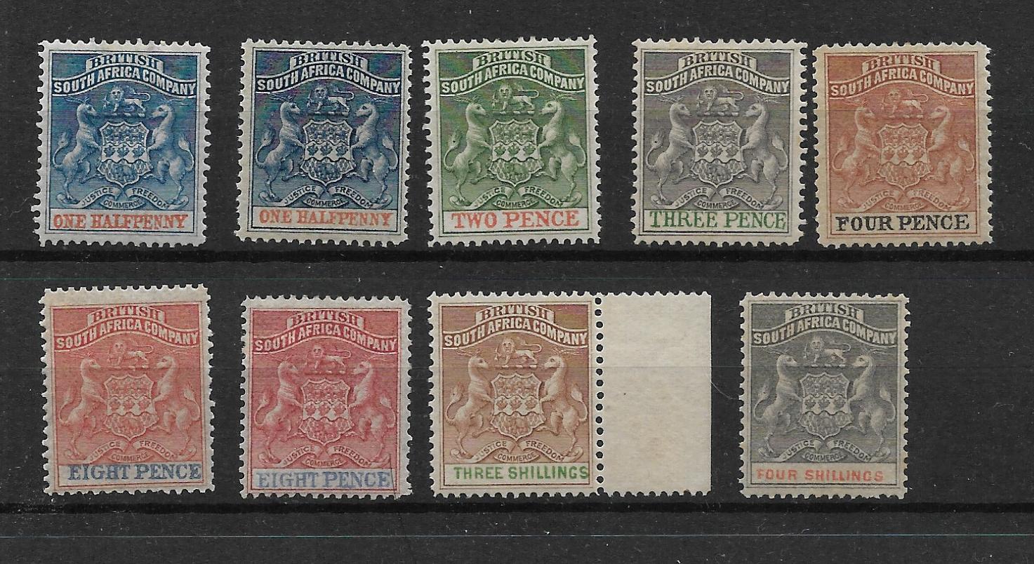 Rhodesia 1892 HalfPenny – Four Shillings SG 18-26. Three Shillings is unmounted mint, but has a small brown gum blemish. Cat £345.