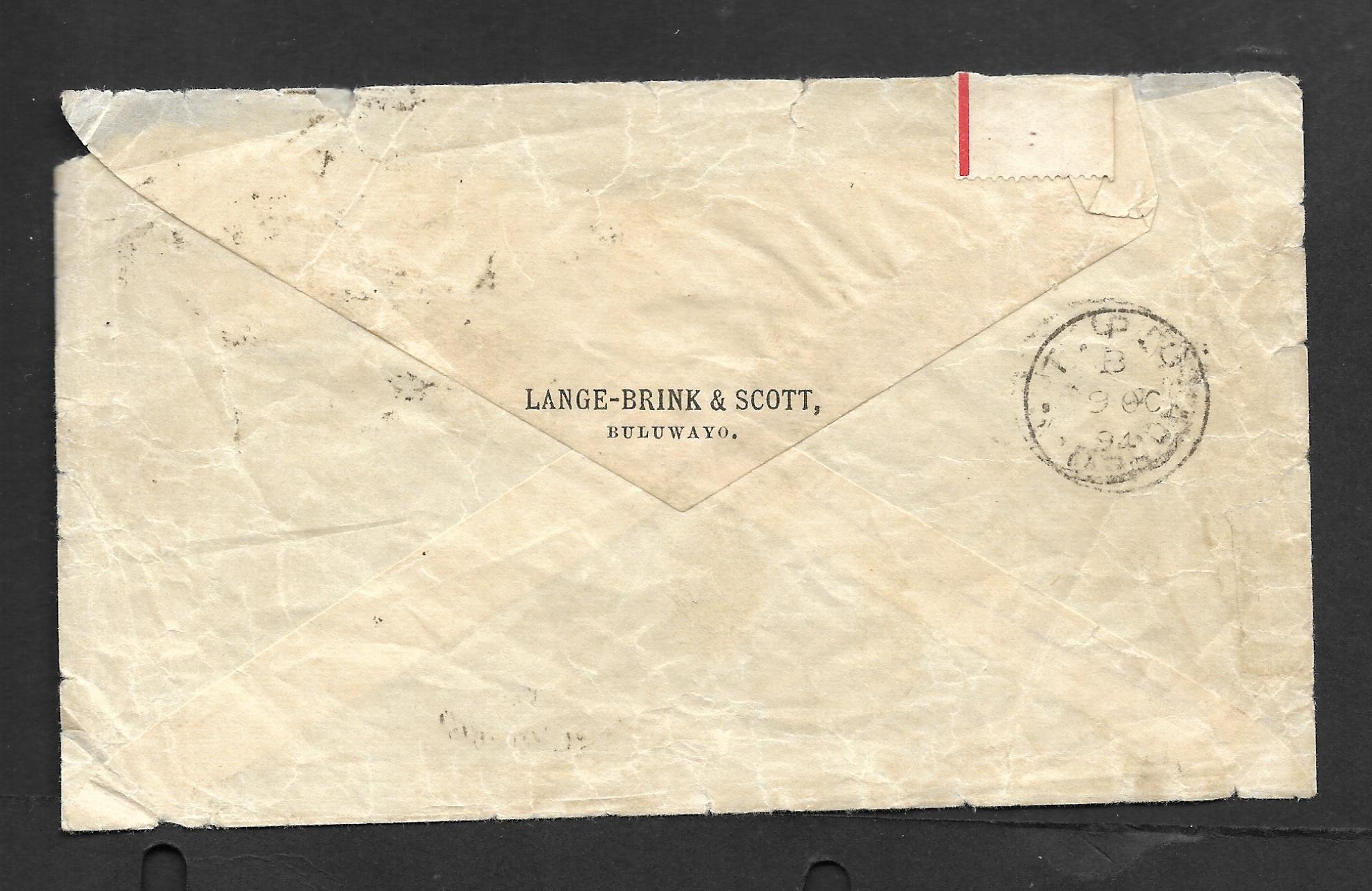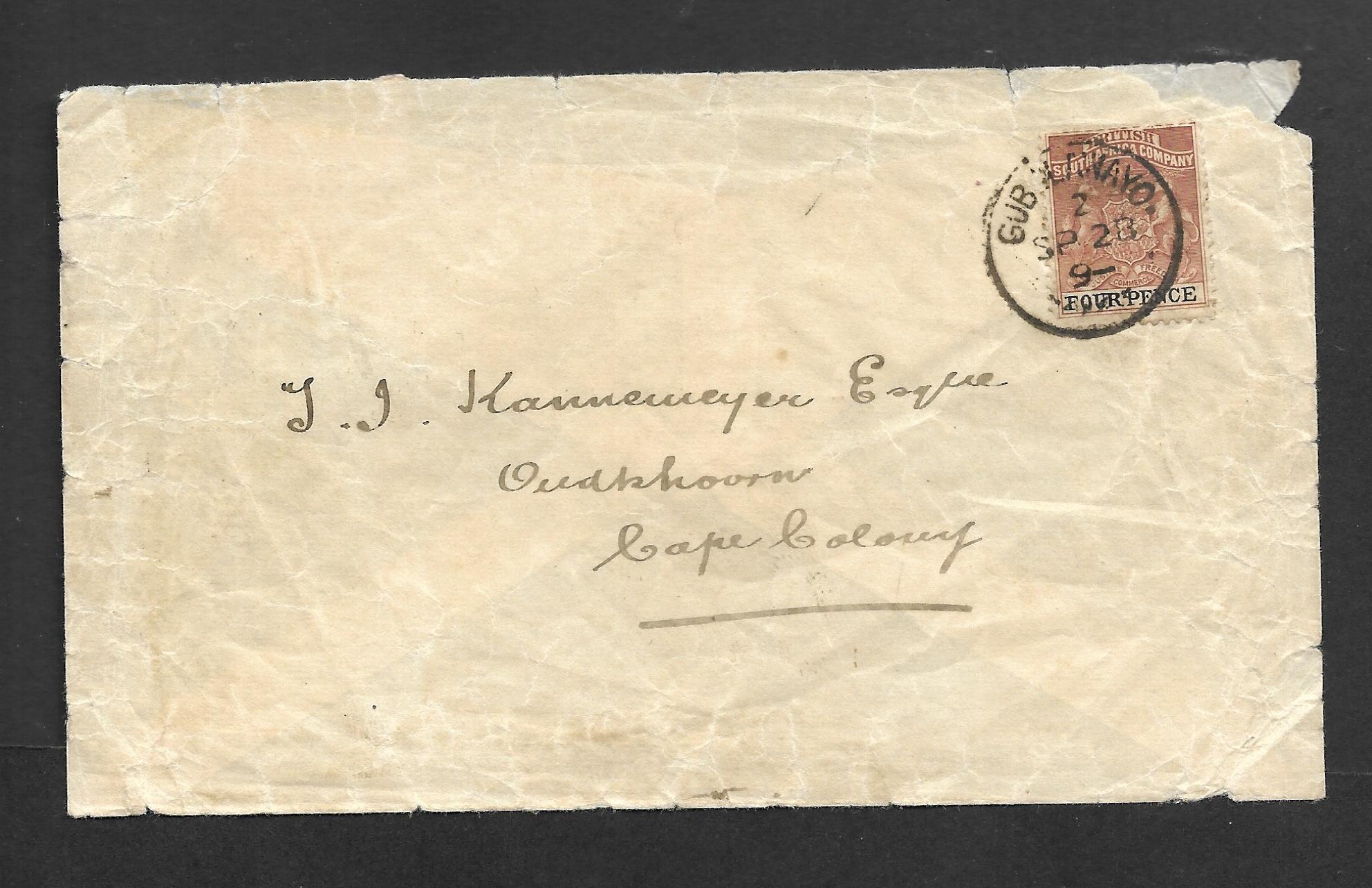 Rhodesia 1894 cover from Gubulawayo to Cape Colony. Part of the excised Bechuanaland can be seen on the Gubulawayo Code 2 postmark dated SP 2 9-. Early rare cover.