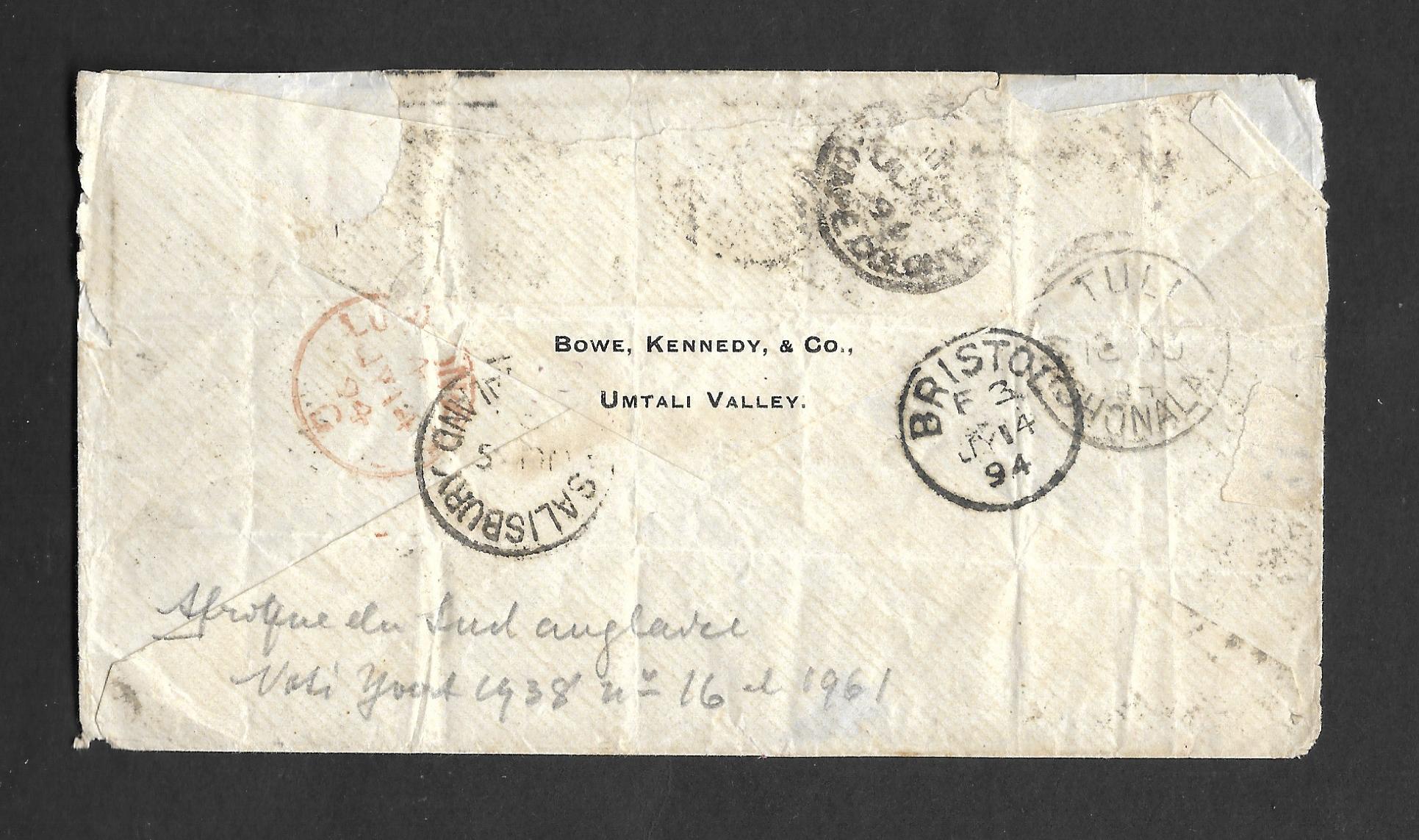 Rhodesia 1894 proving cover from Umtali to London. Has 828 Barred oval cancel with various back stamps including Tuli. Early cover.
