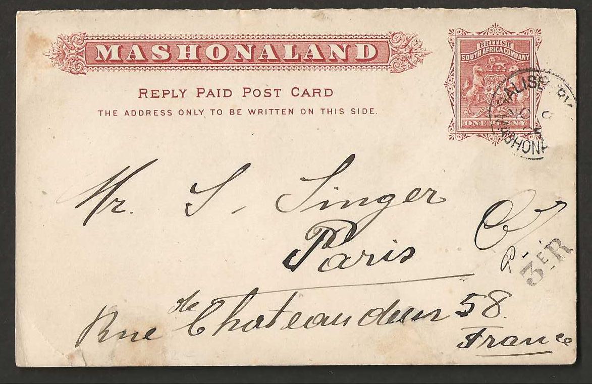 Rhodesia 1895 Reply Paid postcard used at Salisbury and sent to France. Has a Cape town postmark on rear with message.