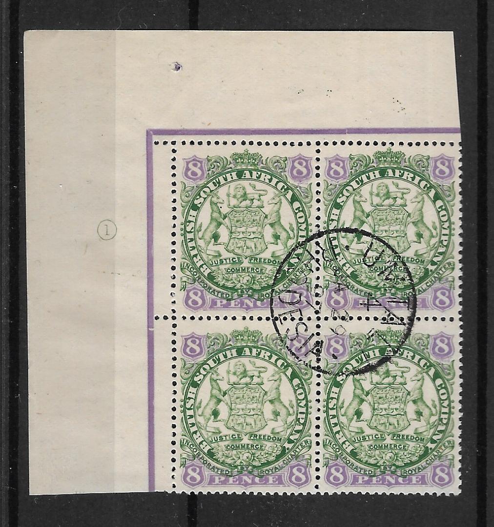 Rhodesia 1896 Large Arms Eight Pence corner block Plate 1 CTO used