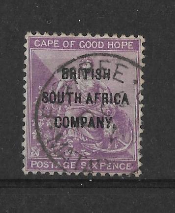 Rhodesia 1896 Six Pence Cape overprint with a FIGTREE Day Month (SC) postmark. Rare usage on Cape overprint.