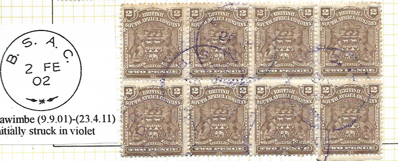 Rhodesia 1898 Two Pence block of eight with KAWIMBE BSACĀ in violet postmarks. Very rare in multiples. A faint no of cancels.
