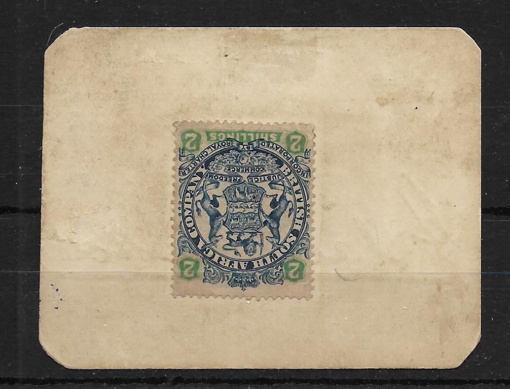 1900 Marshall Hole currency card with Two Shillings Large Arms. Has ‘BULAWAYO’ with stop, ‘ADMINISTRATOR’S OFFICE / BULAWAYO’ cachet. Has rounded corners. Light staining for these.