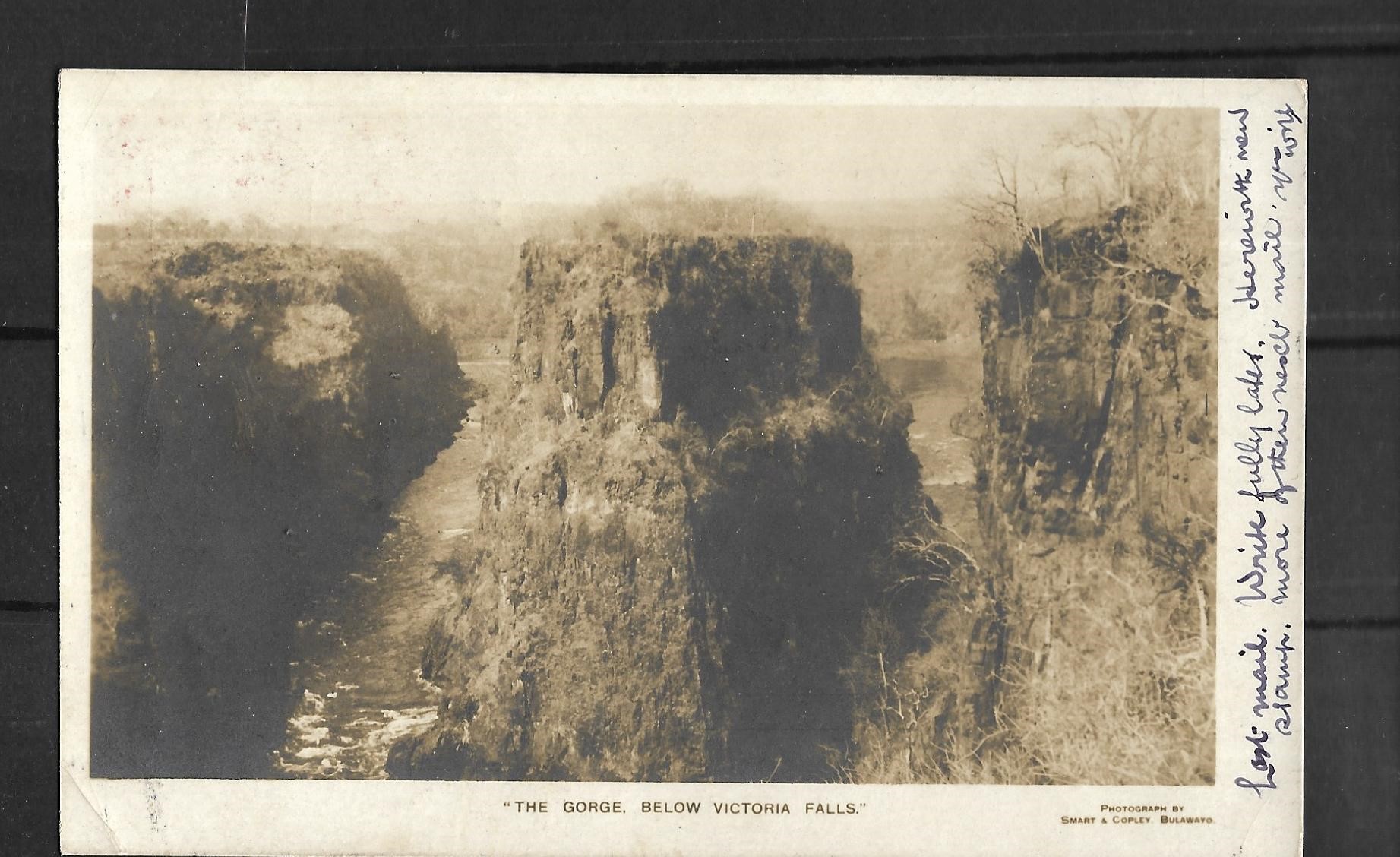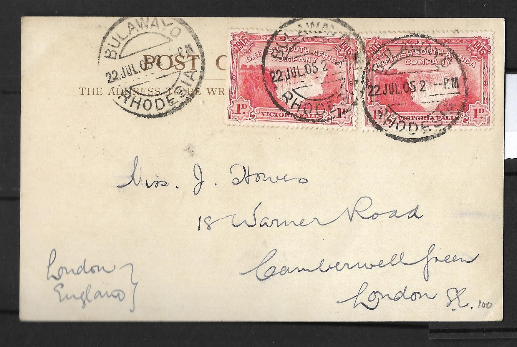 Rhodesia 1905 Victoria Fall One Penny pair with BULAWAYO (DCAJ) postmark on a postcard of Victoria Falls. Card sent to London.
