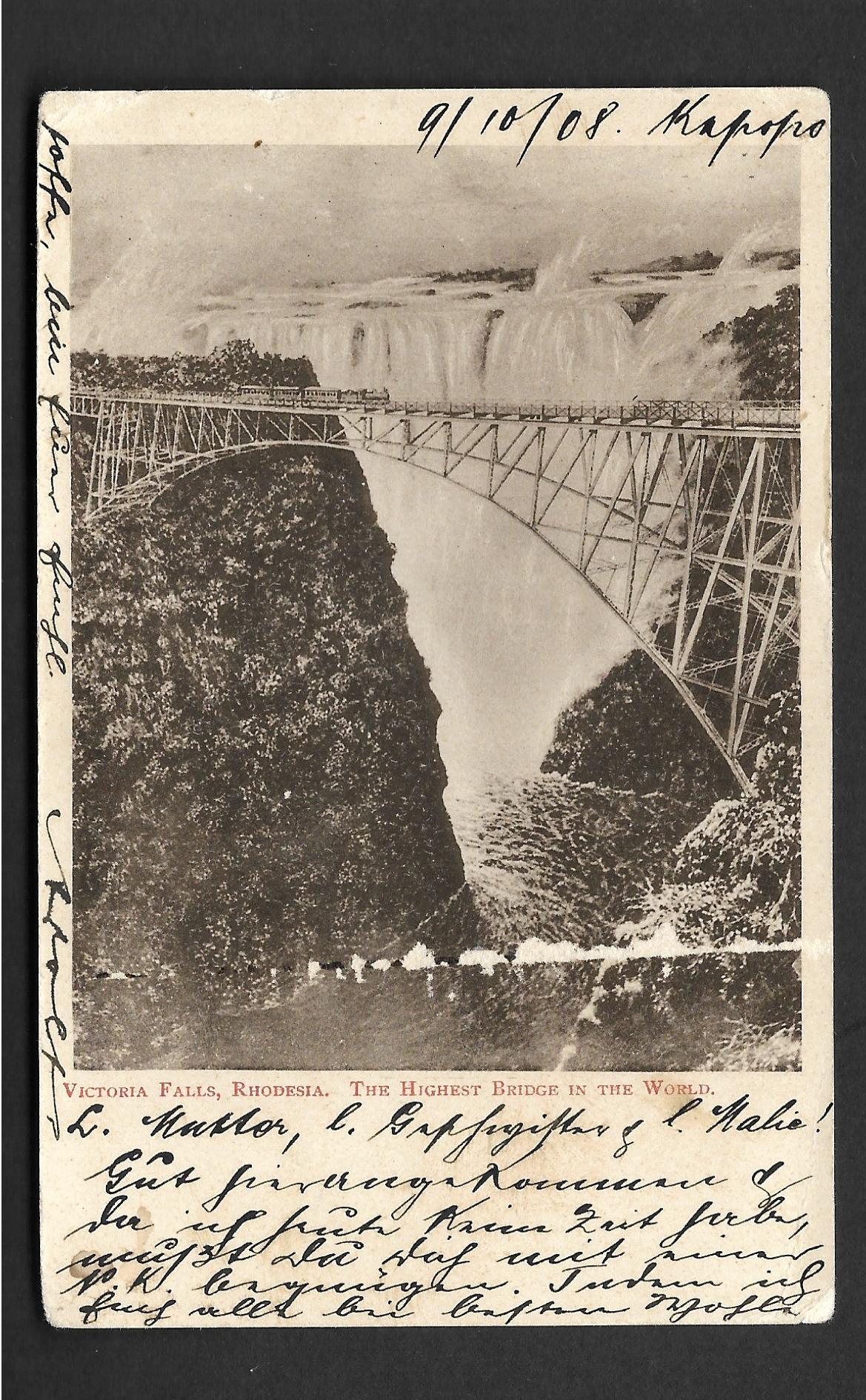 Rhodesia 1908 Picture Postcard Victoria Falls Bridge sent to Germany. HG11a. Has minor damage to front. Very scarce card.