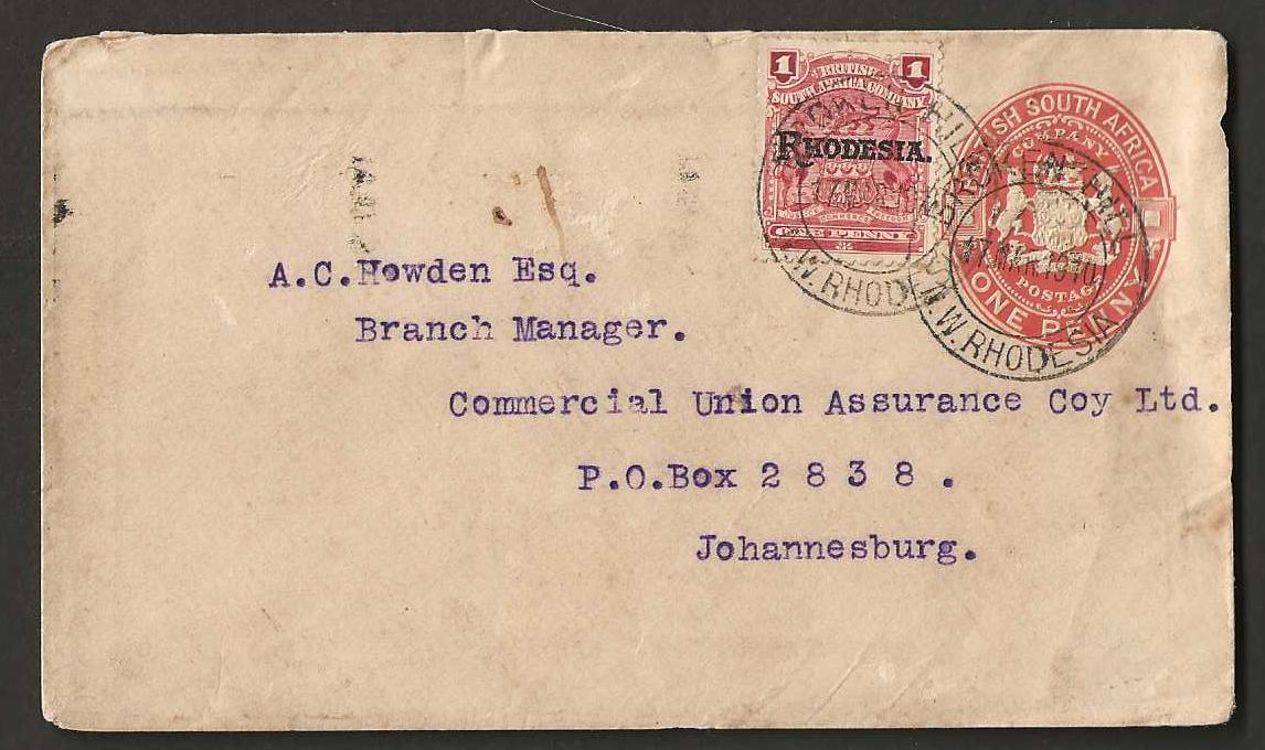 Rhodesia 1909 uprated Postal Stationary envelope used at Broken Hill quantity