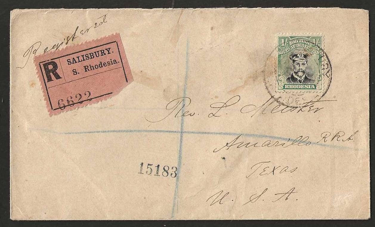 Rhodesia 1920 One Shilling Admiral on Registered cover to United States quantity