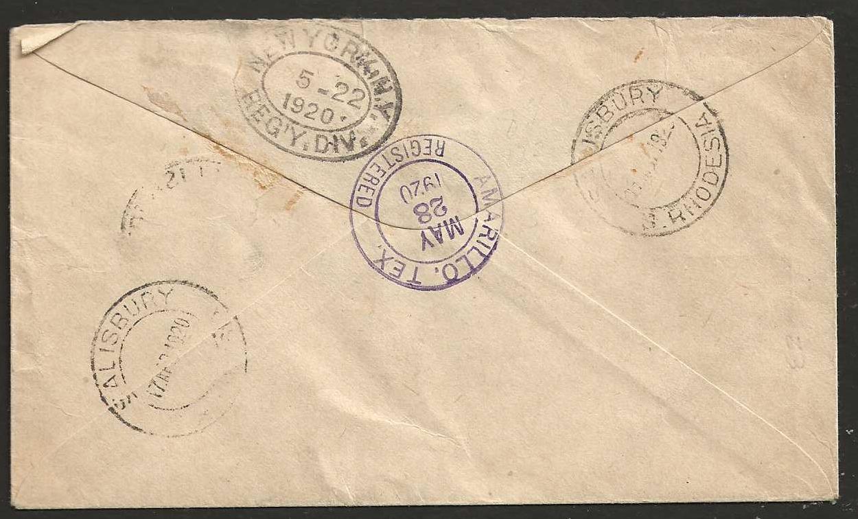 Rhodesia 1920 Registered cover to United States