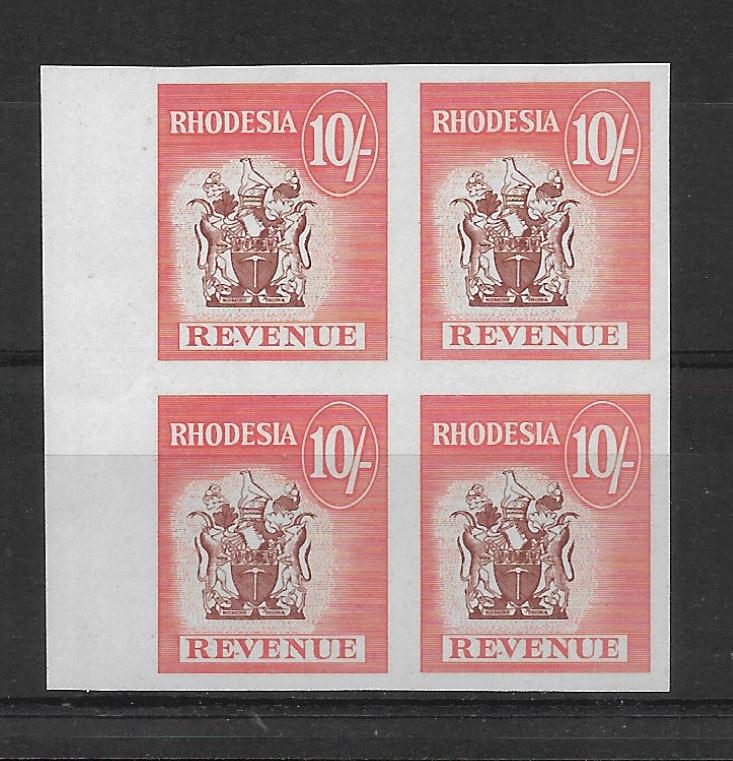 Rhodesia 1966 Revenue Ten Shillings Imperf block of four unmounted mint. Mewett 454.