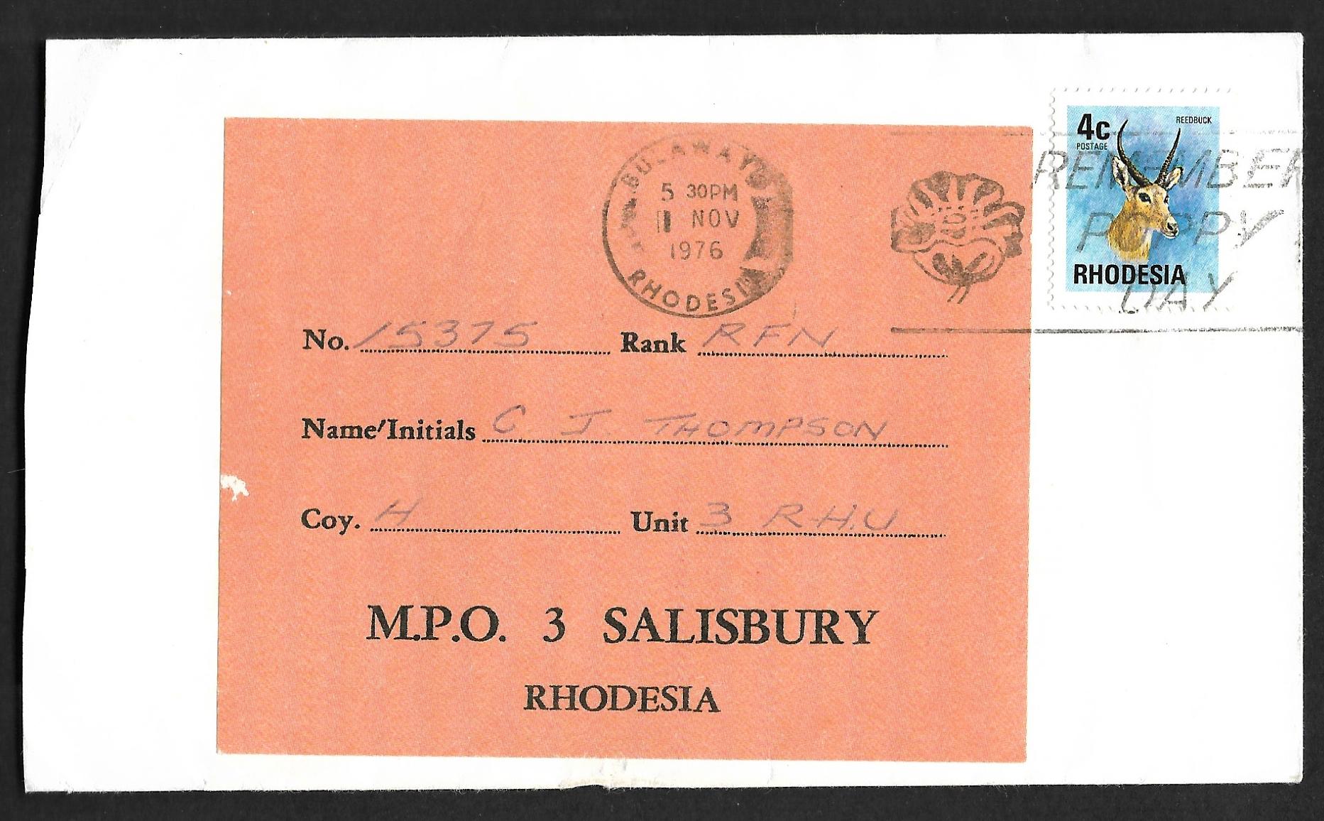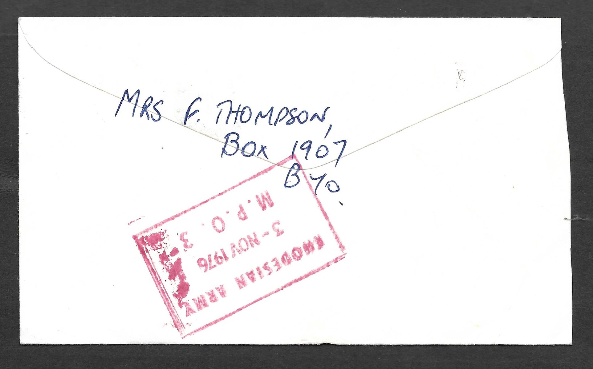 Rhodesia 1976 Bush War MPO 3 cover, to 4 Coy 3 RHU. Label tied to stamp. MPO 3 back stamp.