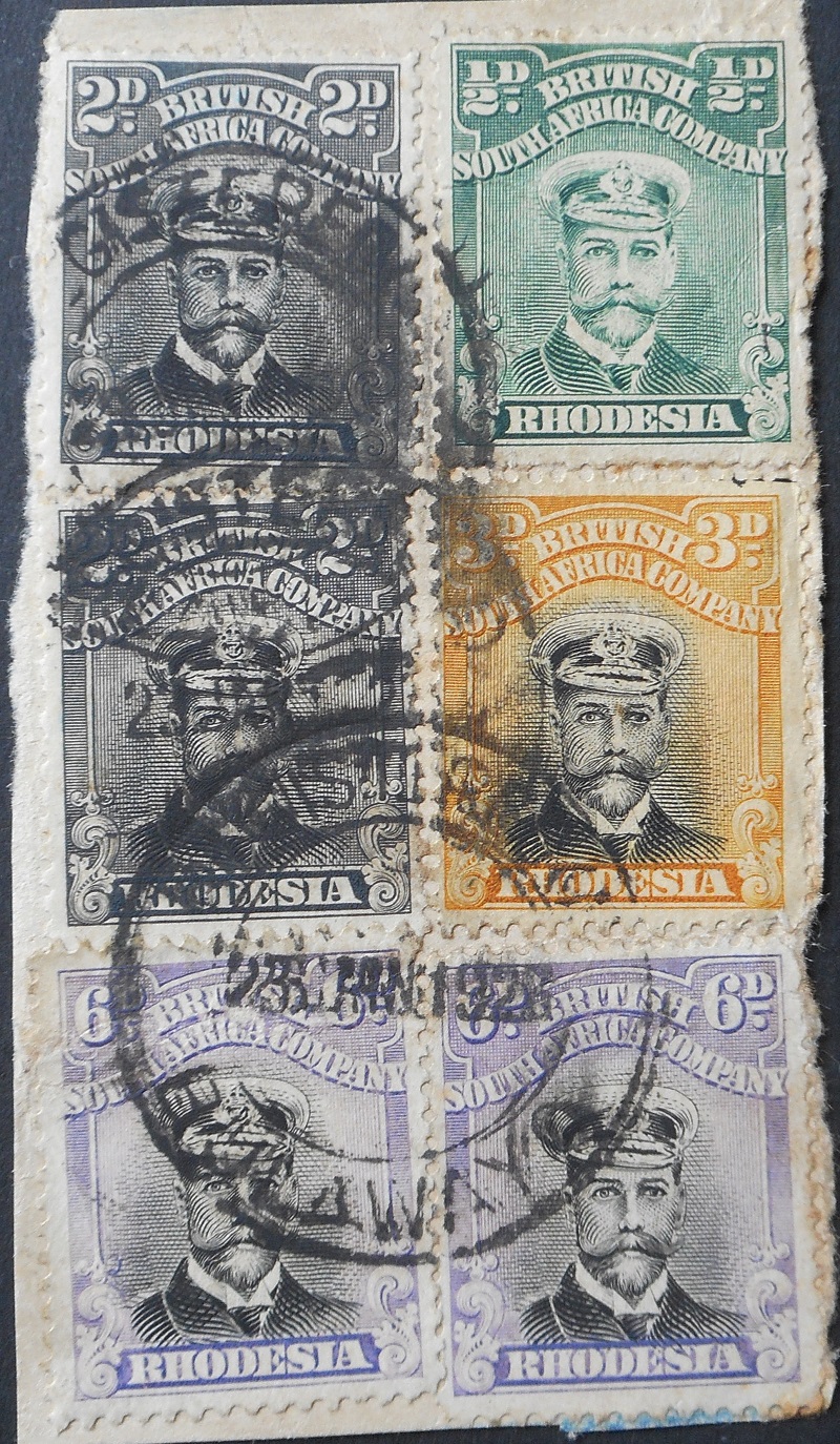 Rhodesia Admiral Die III Two Pence vertical pair, Six Pence pair, Three Pence and Halfpenny on piece used with a REGISTERED BULAWAYO (DC) postmark. RSC Memoir 27 only 1 previously recorded. Total value of stamps One Shilling Seven and a Halfpence. Three Pence has a printers mark at top right. Extremely rare piece dated 23 JAN 1923.