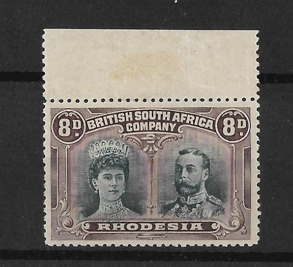 Rhodesia Double Head Eight Pence Greenish Black and Purple with Gash in Ear flaw (Position 2, Mid Gash) unmounted mint. SG 148.