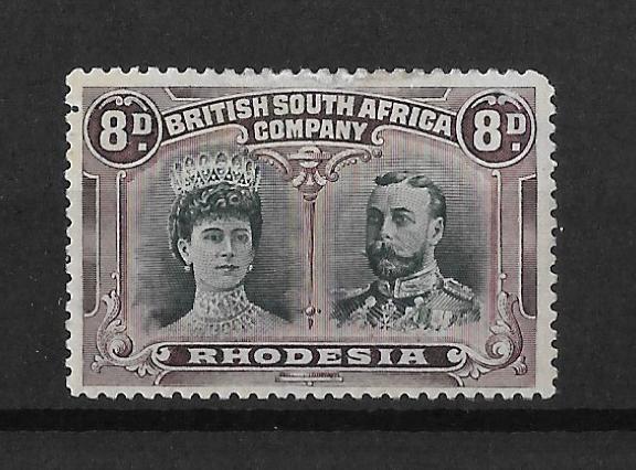 Rhodesia Double Head Eight Pence Greenish Black and Purple with Printers mark at top right mounted mint. SG 148.