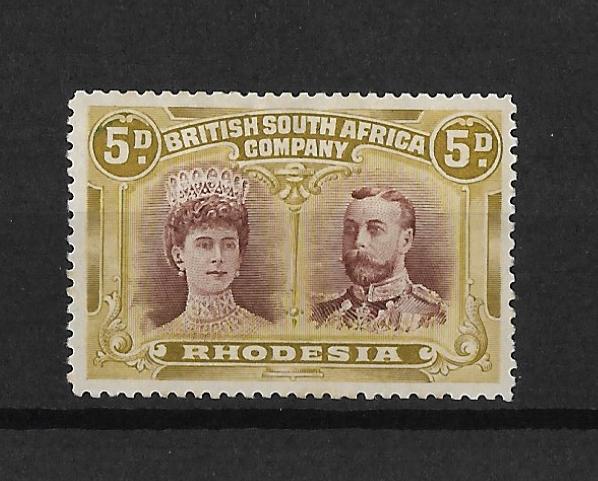Rhodesia Double Head Five Pence Purple-Brown and Olive-Yellow with Gash in Ear flaw (position 2, Long Gash) mounted mint. SG 141a.