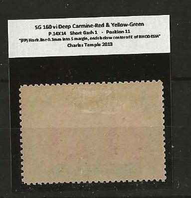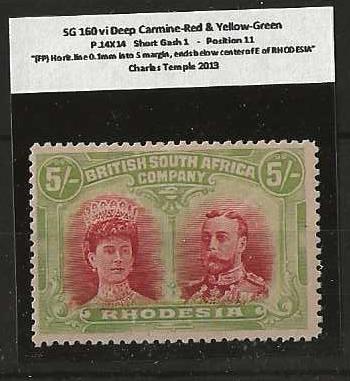 Rhodesia Double Head Five Shillings Deep Carmine Red and Yellow Green Short Gash, Plate 1, pos 11 mounted mint. SG 160. Cat £350.