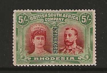 Rhodesia Double Head Five Shillings overprinted SPECIMEN mounted mint.