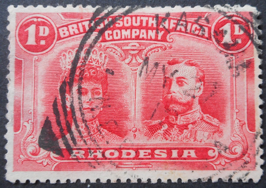 Rhodesia Double Head One Penny used. Stamp is good/fine used with a KASAMA Month Day (Square Circle) postmark. RSC Memoir 34 rated scarce.