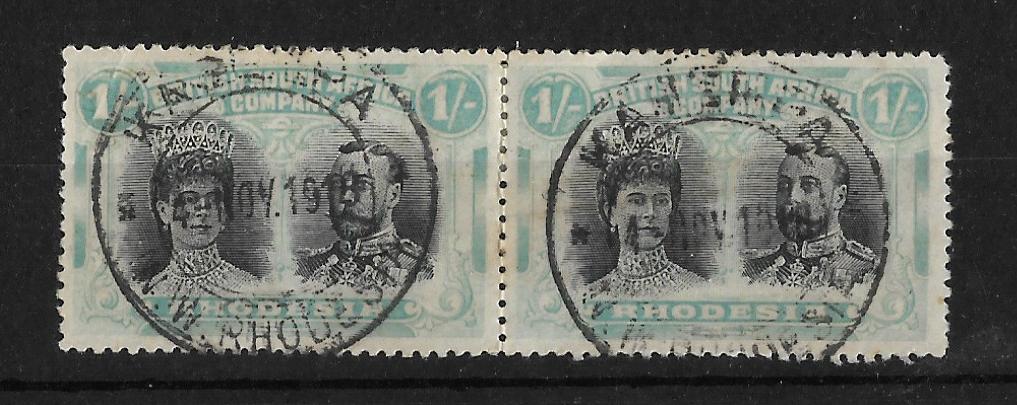 Rhodesia Double Head One Shilling pair with Kasempa (DC) postmark. This strike has an extra line after day and year digit 8 is high, not recorded in RSC Memoir 34.