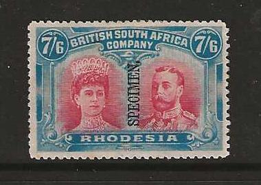 Rhodesia Double Head Seven Shillings and Six Pence overprinted SPECIMEN mounted mint.
