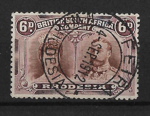 Rhodesia Double Head Six Pence with a FEIRA in jet black viscous ink (DC) postmark, dated 4 SEP 1912. RSC Memoir 34 rated rare.