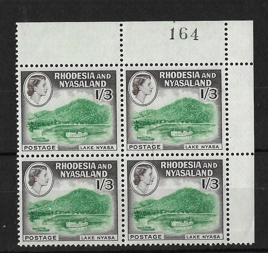 Rhodesia/Nyasaland 1959 QEII One Shilling and Three Pence Lake Nyasa sheet number block of four unmounted mint. SG 26.