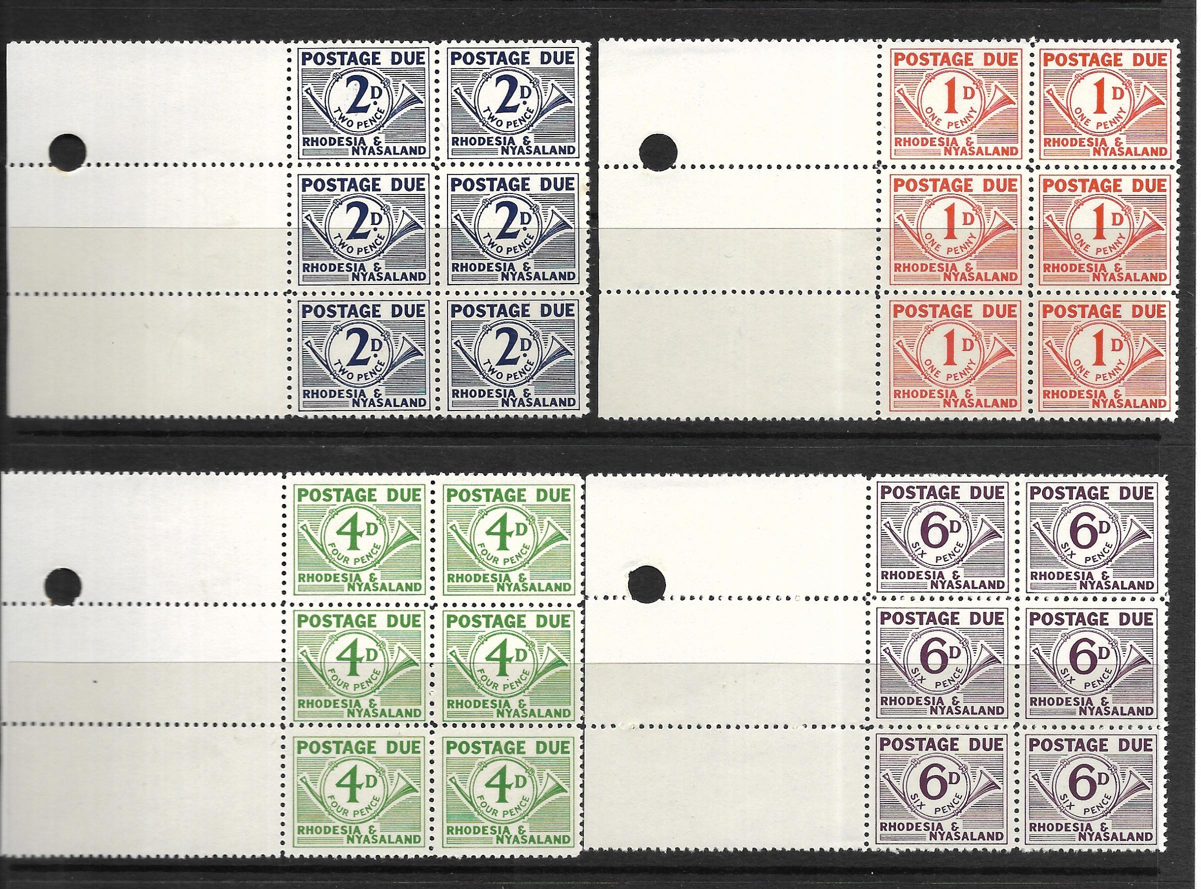 Rhodesia/Nyasaland 1961 Postage Dues Blocks of six unmounted mint. SG D1/D4. Cat £90. Each margin has a punch hole.