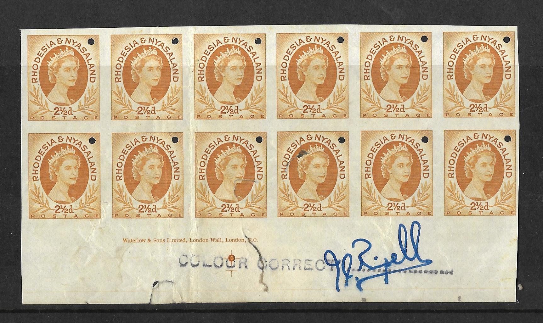 Rhodesia/Nyasaland QEII 1954 Two and a HalfPence Printers Proof block 12. Has Printers Imprint with small punch holes and some notations.  Block has a tear.