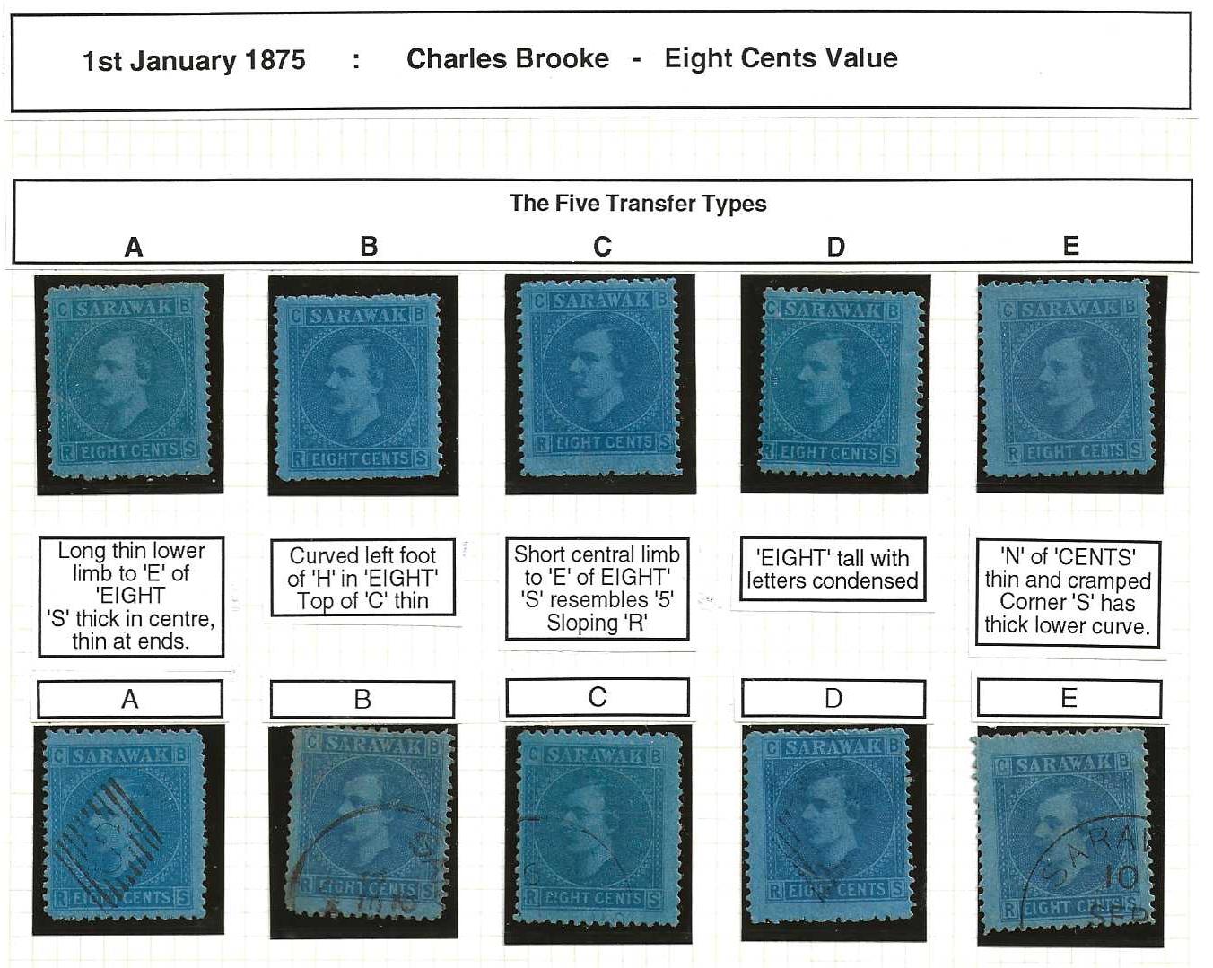 Sarawak 1875 Eight Cents five mint and used showing the five Transfer types. SG 6. Cat £105++.