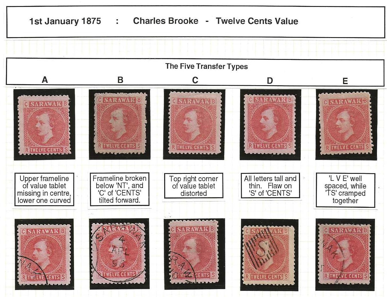 Sarawak 1875 Twelve Cents five mint and used showing the five Transfer types SG 7