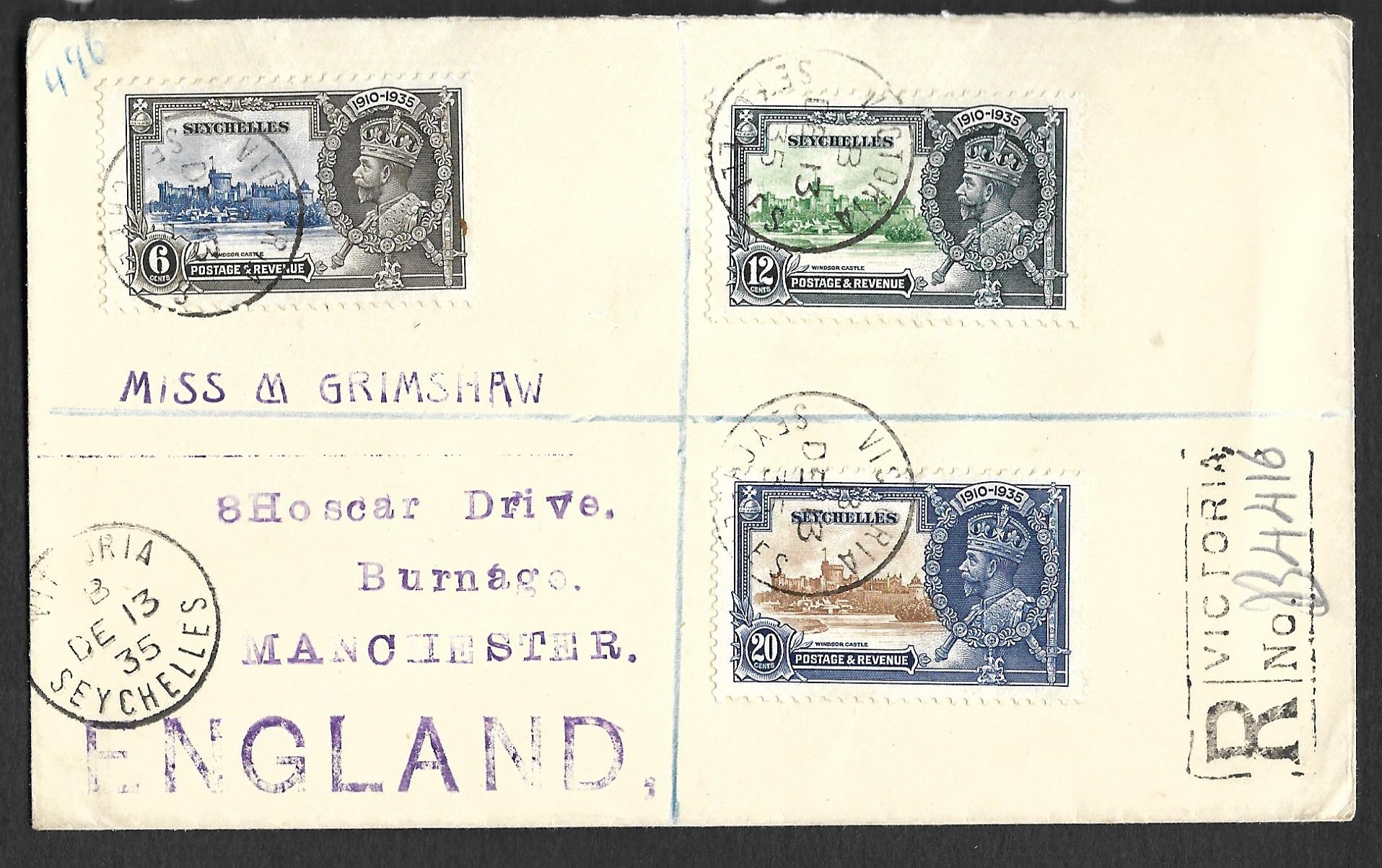 Seychelles 1935 George V Silver Jubilee registered cover to England, not first day. Has the three low values.