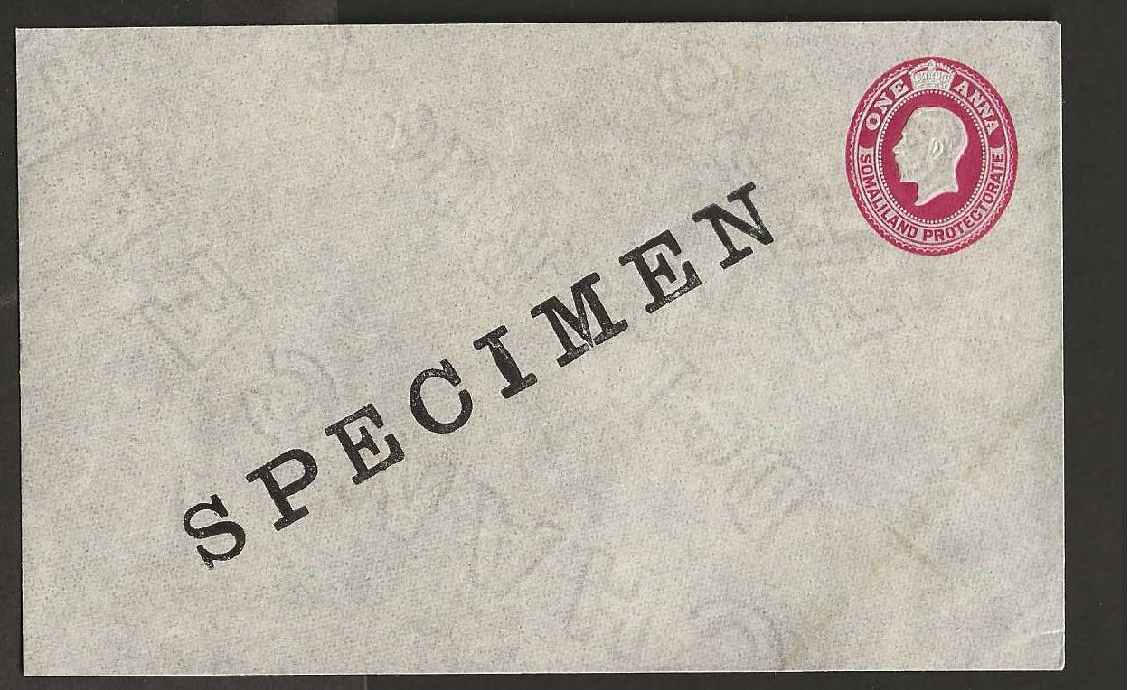 Somaliland Protectorate 1912 George V Postal Stationary envelope One Anna Carmine overprint Specimen mint. This is the only postal stationary envelope issued to the territory.