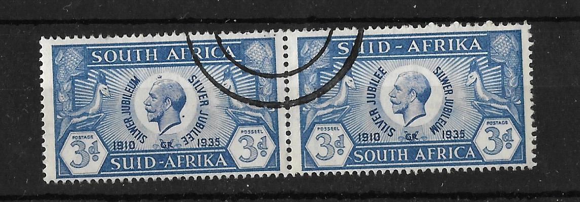 South Africa 1935 George V Silver Jubilee Three Pence pair with spots above head variety fine used. SG 67b. Cat £140.