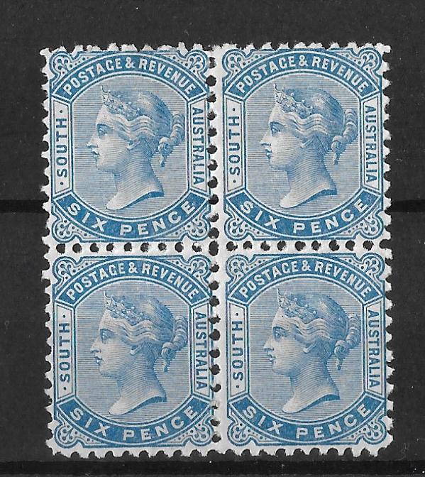 South Australia 1883 Queen Victoria Six Pence block of four mint. SG 185. Cat £300. (Two stamps are unmounted mint).