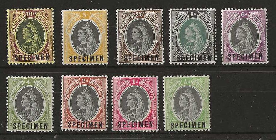 Southern Nigeria 1901 Queen Victoria Halfpenny to Ten Shillings set overprinted SPECIMEN mounted mint. SG 1s/9s. Cat £250.