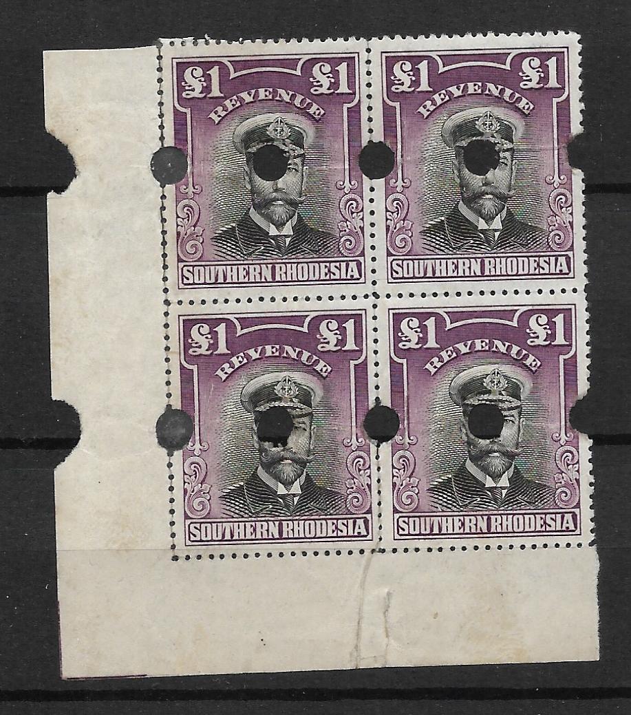 Southern Rhodesia 1924 George V Admiral One Pound plate proof block of four with punch holes. Mewett 217. Ex. Waterlow archive.