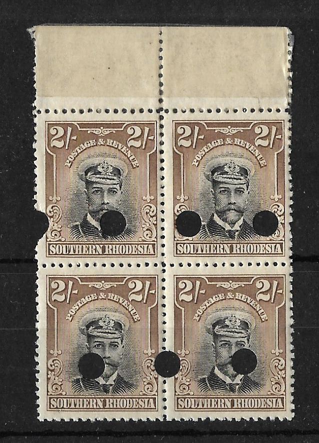 Southern Rhodesia 1924 George V Admirals Two Shillings marginal block of four plate proof (From the printer’s archive). Each stamp has at least one punch hole.