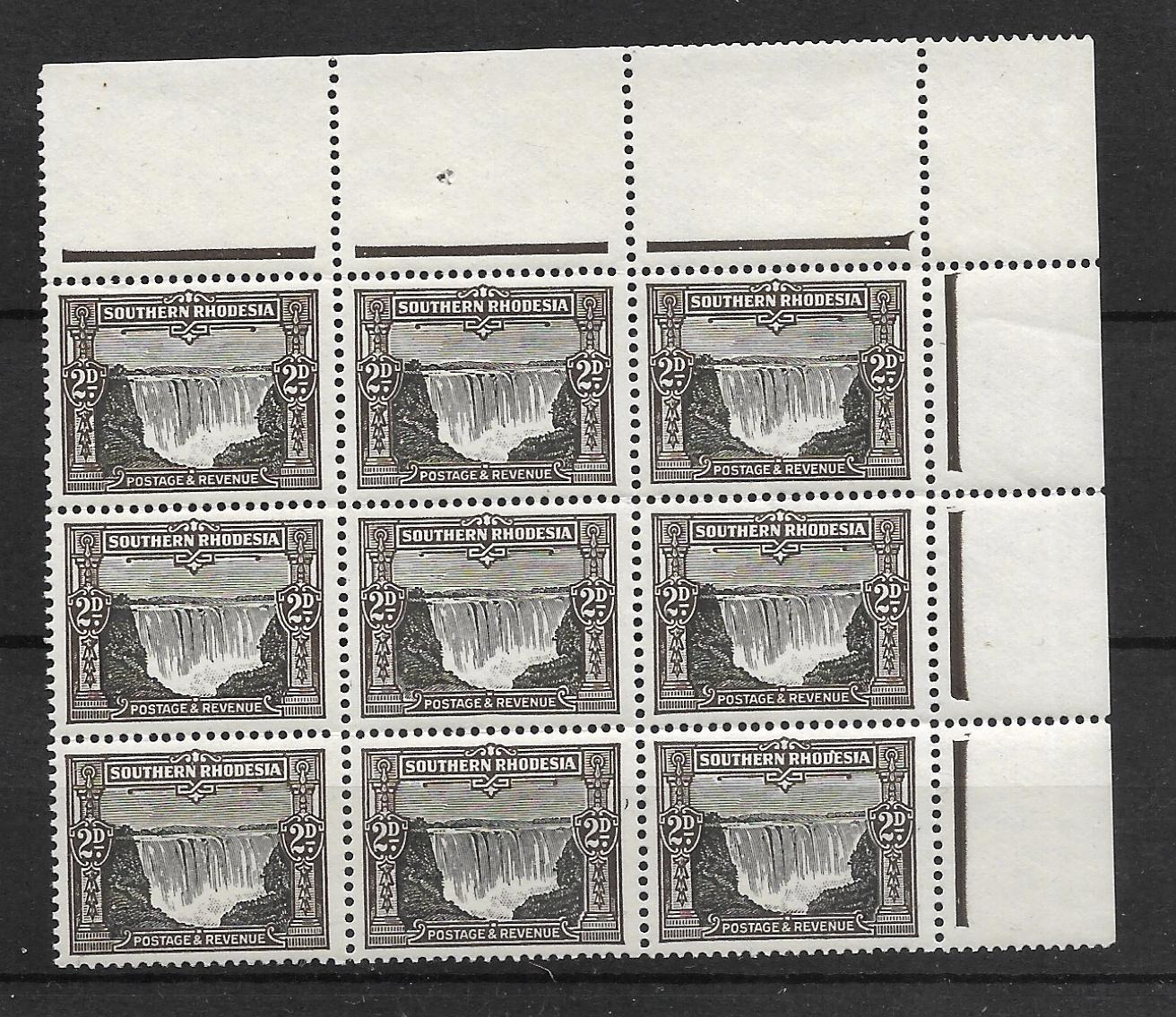 Southern Rhodesia 1931 Two Pence Small Falls top right corner marginal block of nine unmounted mint. SG 17. Cat £126.