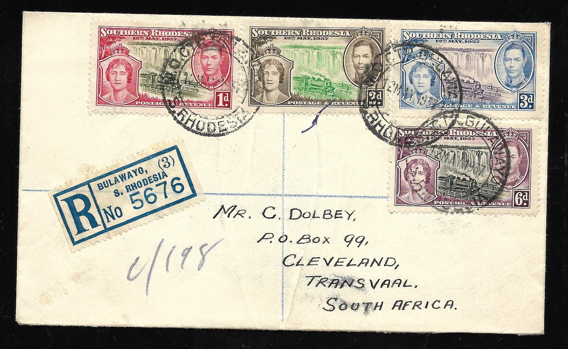 Southern Rhodesia 1937 George VI Coronation set on First day cover. Has a M.O. CTR Branch Salisbury (DC) postmark. With original letter complaining that there was an issue with the availability of this issue. Scarce cancel.