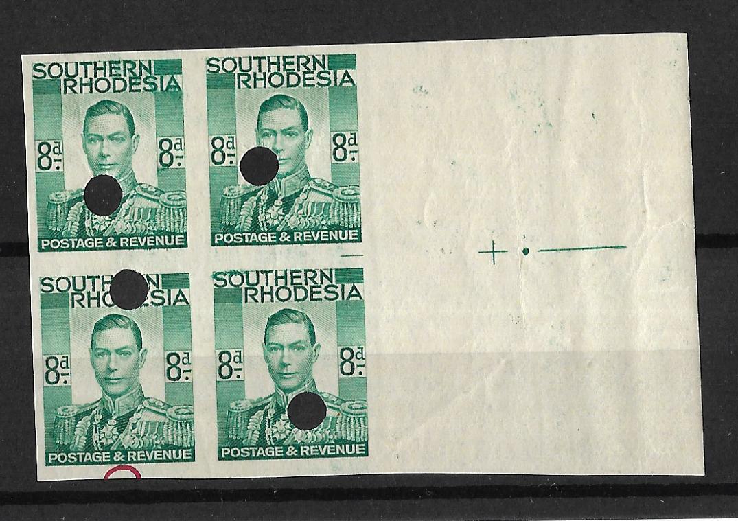 Southern Rhodesia 1937 George VI Eight Pence Imperforate plate proof block of four with punch holes. From right centre of the sheet. SG 45.