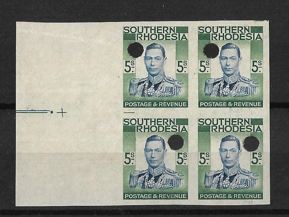 Southern Rhodesia 1937 George VI Five Shillings Imperforate plate proof block of four with punch holes. From left centre of sheet. SG 52.